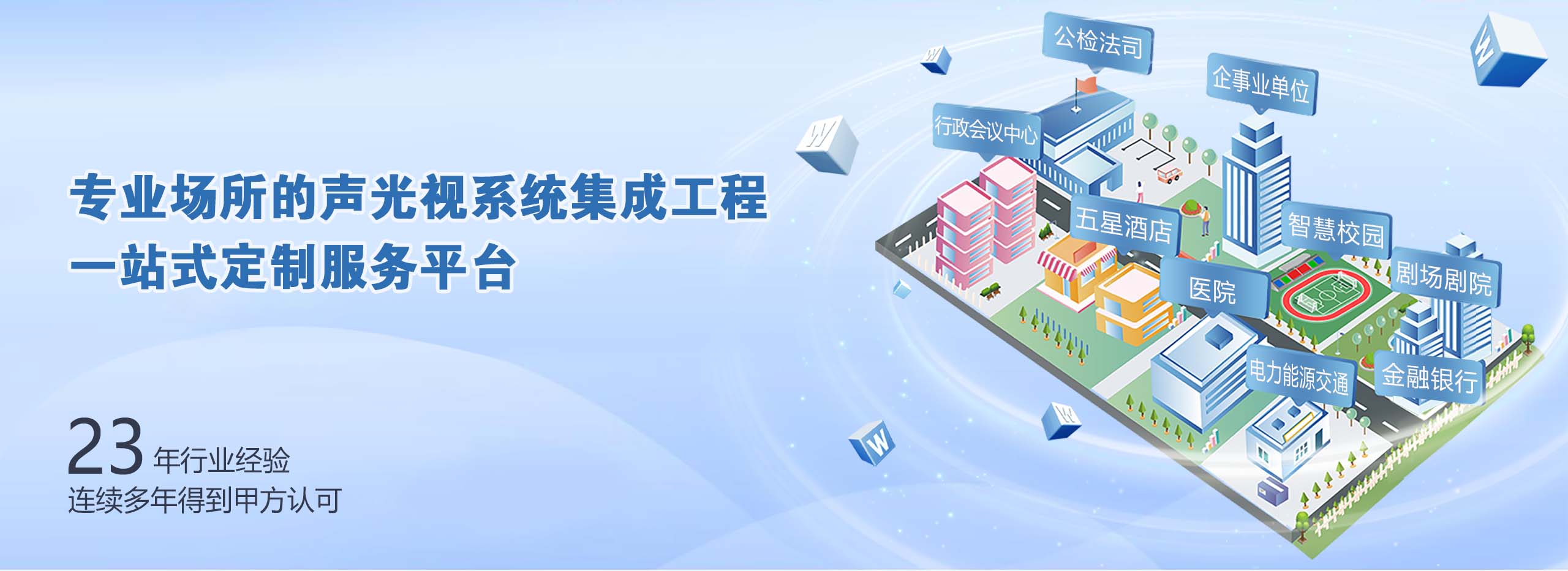 智能化會議室、多功能廳、報告廳、多媒體教室、錄播教室科技館博物館展廳、智慧校園、指揮中心等各類型音視頻系統集成項目工程